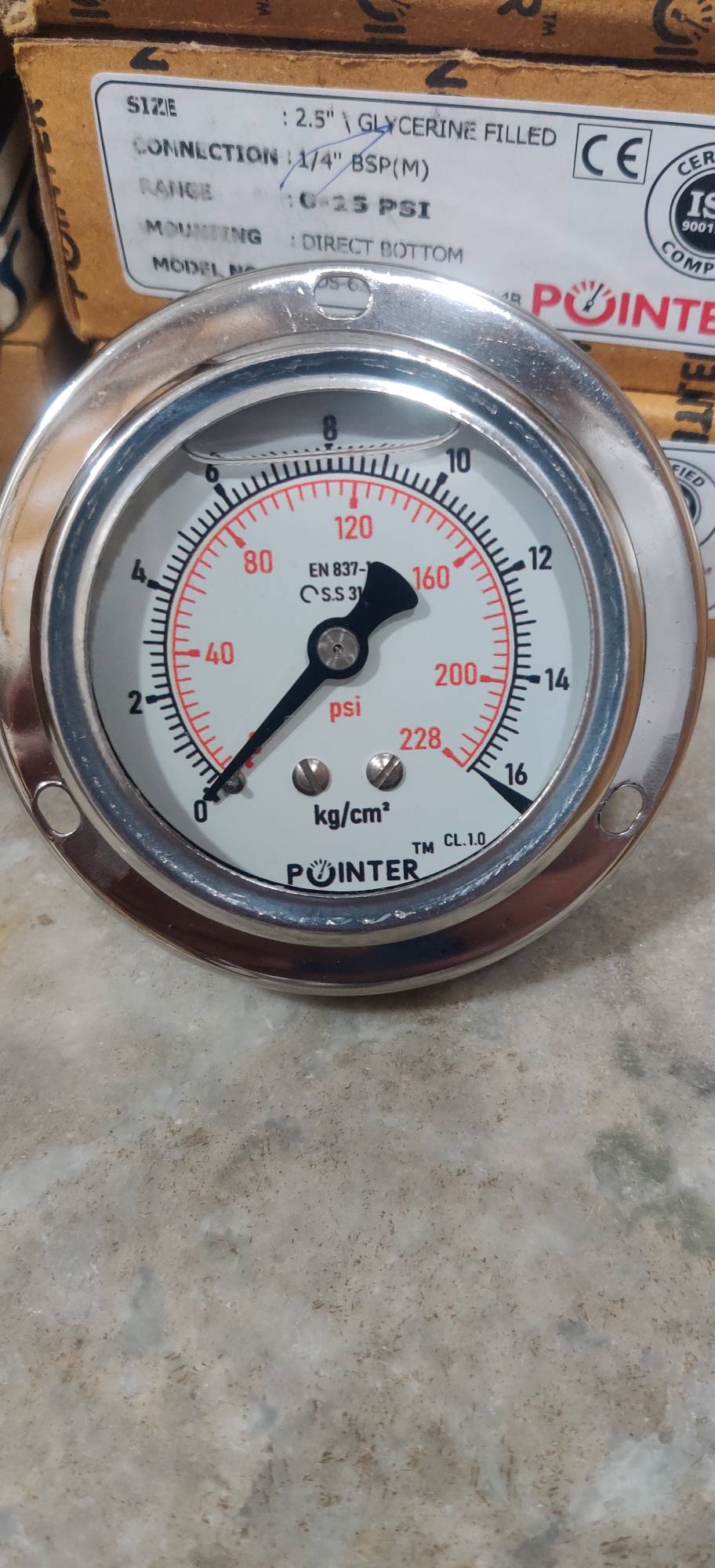pointer brand complete stainless steel with glyreciene filled pressure gauge with glyreciene filled pressure gauge 2.5" dial 0 to 16 kgcm2 1/4 bsp back Connection panel mounting