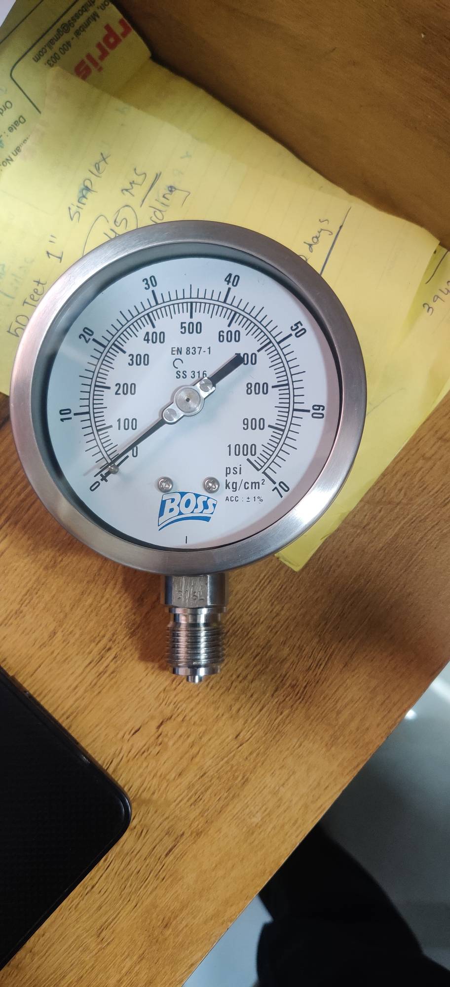 boss make complete stainless steel with glyreciene filled pressure gauge dial size: 100 mm range : 0 to 70 kg connection: 1/2 bsp bottom available ready stock