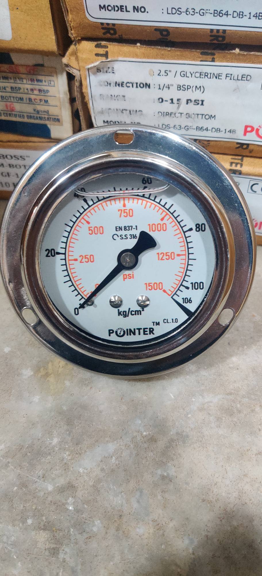 Pointer brand complete stainless steel with glyreciene filled pressure gauge 2.5" dial 0 to 10 kg/cm2 1/4 bsp back Connection panel mounting available ready stock